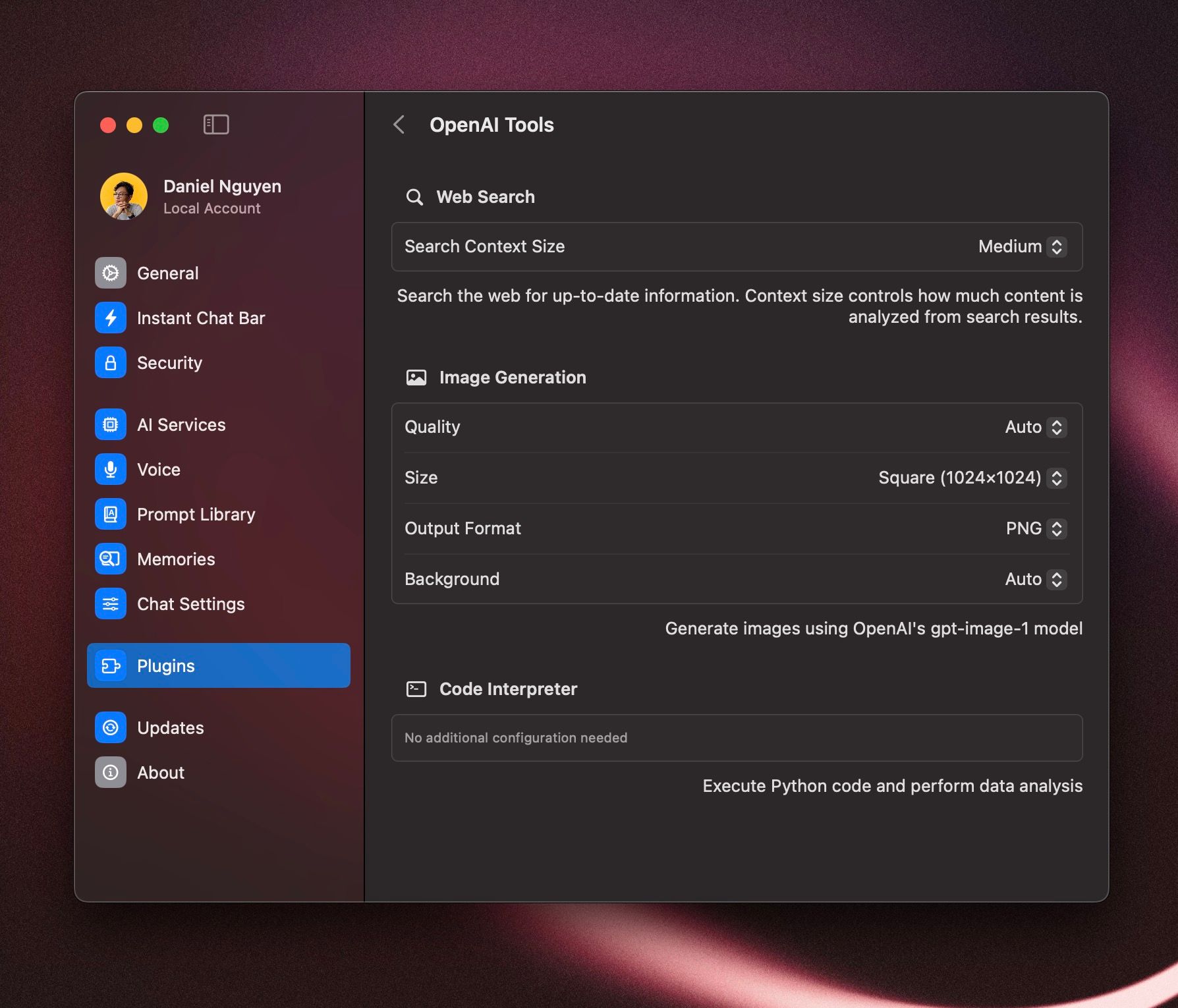 For example, when using the OpenAI provider, you can also use native tools such as Web Search, Image Generation, Code Interpreter, and more. Go to Settings > Plugins to configure native provider tools.